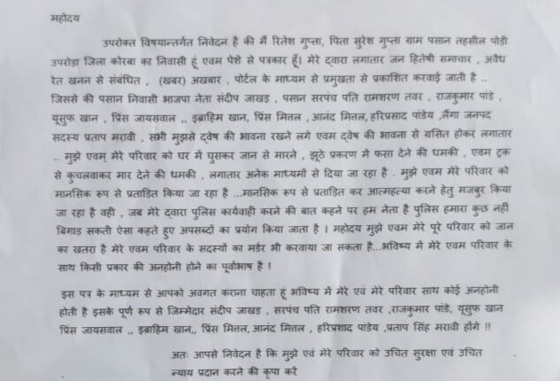 ज्ञात हो कि पसान निवासी पत्रकार रितेश गुप्ता ने अपने क्षेत्र के ग्राम बैरा स्थित बम्हनी नदी से जिला प्रशासन द्वारा प्रतिबंध अवधि के बाद भी रेत का खुलेआम अवैध खनन एवं परिवहन से संबंधित खबरों का प्रकाशन प्रमुखता से किया था। जिन खबरों में रेत चोरों के साथ ग्राम सरपंच, पुलिस व खनिज विभाग के सांठगांठ होने का अंदेशा को भी दर्शाया था। रेत चोरी से संबंधित छापे गए खबरों से बौखलाए उक्त कार्य मे संलिप्त लोगों द्वारा पत्रकार रितेश गुप्ता को झूठे मामले में फसाने हेतु षड़यंत्र पूर्वक उसके विरुद्ध भयादोहन सहित अन्य धाराओं के तहत पसान थाना में अपराध दर्ज करा दी गई। जिस मामले को लेकर सदभाव पत्रकार संघ छत्तीसगढ़ सहित अन्य समाजसेवी व राजनीतिक पार्टी द्वारा निष्पक्ष जांच कर पत्रकार को दोषमुक्त करने पुलिस के आला अधिकारियों से मांग किया गया था। जिसे लेकर फिलहाल पुलिस की जांच कार्यवाही चल रही है। किंतु रेत चोरी में संलिप्त लोग अब उक्त पत्रकार के दुश्मन बन बैठे है। जिसे लेकर पत्रकार रितेश ने अपने व परिवार को जान का खतरा होना बताकर एसपी कार्यालय में नामजद आवेदन देकर सुरक्षा की गुहार लगाई है। पत्रकार रितेश गुप्ता द्वारा दिए गए अपने आवेदन में उल्लेख किया है कि मैं रितेश गुप्ता, पिता श्री सुरेश गुप्ता, ग्राम पसान तहसील उप, जिला कोरबा का निवासी हूं एवं पेशे से पत्रकार हूँ। मेरे द्वारा लगातार जन हितेषी समाचार के अलावा अवैध रेत खनन से संबंधित खबरें अखबार व पोर्टल के माध्यम से प्रमुखता से प्रकाशित करवाई गई। जिससे कि रेत खनन का खबर प्रकाशन के बाद पसान निवासी भाजपा नेता संदीप जाखड़, पसान सरपंच पति रामशरण तवर, लैंगा जनपद सदस्य प्रताप मरावी के साथ राजकुमार पांडे, यूसुफ खान, प्रिंस जायसवाल, इब्राहिम खान, प्रिंस मितल, आनंद मित्तल , हरिप्रसाद पांडेय सभी मुझसे द्वेष की भावना रखने लगे है। तथा द्वेष की भावना से ग्रसित होकर लगातार मुझे एवं मेरे परिवार को घर में घुसकर जान से मारने, झूठे प्रकरण में फंसा देने व वाहन से कुचलवाकर मार देने की धमकी लगातार अनेक माध्यम से देते हुए मुझे और मेरे परिवार को लगातार मानसिक रूप से प्रताड़ित करते हुए आत्महत्या करने हेतु मजबूर किया जा रहा है। जब मेरे द्वारा पुलिस में शिकायत करने की बात कहने पर हम नेता है, पुलिस हमारा कुछ नहीं बिगाड़ सकता, ऐसा कहते हुए अपशब्दों का प्रयोग किया जाता है। महोदय मुझे एवम मेरे पूरे परिवार को जान का खतरा है। मेरे परिवार के सदस्यों का मर्डर भी करवाया जा सकता है। वहीं भविष्य में मेरे एवं परिवार के साथ किसी भी प्रकार की अनहोनी घटना होने का पूर्वाभाष है। अतः इस पत्र के माध्यम से आपको अवगत कराना चाहता हूँ कि भविष्य में मेरे एवं मेरे परिवार के साथ कोई भी अ
