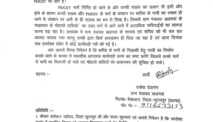 विनोद गुप्ता / सूरजपुर जिले के भैयाथान ब्लॉक ग्राम पंचायत खडगांव मांझपारा मोहल्ले में सड़क की पानी पूरे ग्राम पंचायत के घरों में पानी घुसना शुरू हो गया जगनारायण देवांगन के घर से शिवलाल के घर तक 300 मीटर की सीसी रोड का निर्माण के और नाली के लिए ग्रामीणों ने सरपंच सचिव को कई बार गुहार लगाएं की बारिश शुरू होने से पहले हमारी नाली का निर्माण और सीसी रोड का निर्माण करा दिया जाए पर सरपंच के कान में जूं तक नहीं गया क्योंकि नाली का निर्माण बहुत ही जरूरी है एक वृद्ध दुलारी बाई खडगांव मांझपारा के निवासी है और घर में अकेले रहती हैं वृत्त के घर में रोड की पानी पुरी घर में घुस चुका है वह बुजुर्ग दुलारी भाई इतना डरी हुई है और कई बार सरपंच सचीवं को गुहार लगा चुकी है और ग्रामवासी नाली और सीसी रोड के लिए अनेकों बार शिकायत की है पर आज तक निर्माण नहीं हो पाया ग्रामीणों ने मुख्य कार्यपालन अधिकारी जनपद पंचायत भैयाथान को भी आवेदन दिए हैं पर आज तक उस आवेदन पर अमल नहीं किया जा सका नतीजा ग्राम पंचायत में पूरी पानी सभी के घरों में पानी घुसना शुरू हो गया है और ग्राम पंचायत में ग्राम वासी भारी आक्रोश में है और जनप्रतिनिधियों से गुहार लगा रहे हैं कि जल्द से जल्द सीसी रोड का निर्माण और नाली का निर्माण किया जाए और पानी निकासी की समस्या खत्म हो सके।