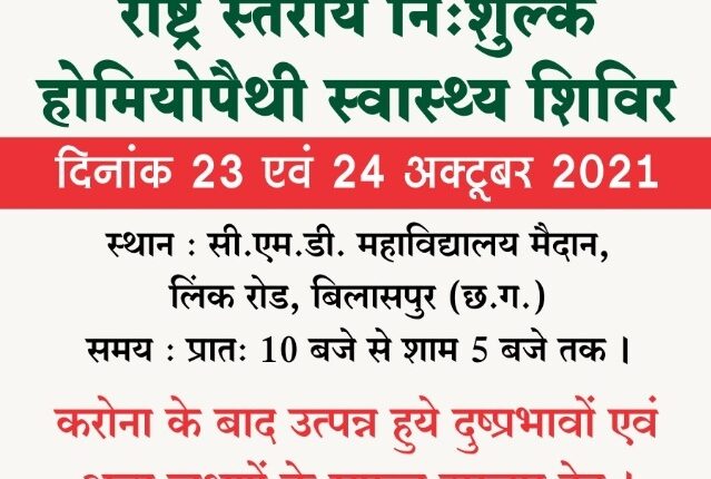 छत्तीसगढ़ वासियों के लिए वरदान साबित हो सकता है यह राष्ट्रीय होम्योपैथिक कैंप, चिकित्सकीय सलाह, जांच एवं दवाइयां मिलेंगे निशुल्क..