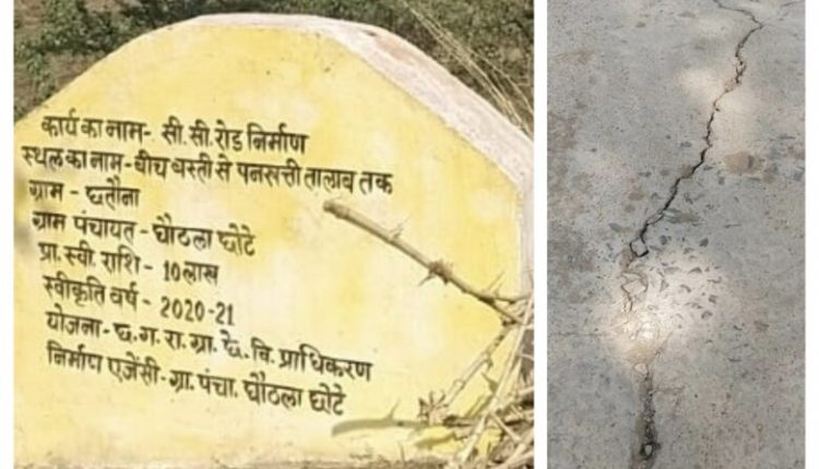 आपको बता दे ग्राम पंचायत घोटला छोटे में विगत वर्ष 2020/21 में एक सीसी रोड का निर्माण कार्य पूर्ण कर लिया गया।जिसमे खुलेआम स्तरहीन कार्य कराया गया।बताना लाजमी होगा कि कुछ ही दिनों में उस सीसी रोड की हालत इतनी खराब हो गई कि अब उसमें बड़ी बड़ी दरारे पड़ने लगी है ।जिसे देखने मात्र से यह प्रतीत हो रहा है की अगले एक या दो महीने में वह सीसी रोड टूटकर दो टुकड़े में विभाजित हो जाएगा ।हालांकि यह जांच का विषय है परंतु सीसी रोड में पड़ी दरारे साफ तौर पर यह बयां कर रही है कि उसे बनाने का उद्देश्य केवल और केवल सरपंच और सचिव पैसे कमाने की नीयत से शासन की राशि का दुरुपयोग किये है ।