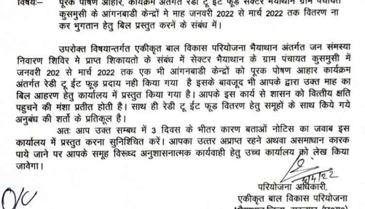 सूरजपुर -मोहिबुल हसन(लोलो)….. पोषण आहार कार्यक्रम अंतर्गत रेडी टू ईट फूड प्रदाय नहीं किया गया है शासन की महत्वकांक्षी योजना का परिसंचालन एवं देख-रेख ठीक ढंग से नहीं होने के कारण योजनाओं का लाभ हितग्राहियों को नही मिल पा रहा है। यही कारण है कि शासन की बहुमुखी योजना मात्र औपचारिक बनकर रह गई है। महिला बाल विकास द्वारा संचालित स्व सहायता समूह के अध्यक्ष सचिव , समूह की मिली-भगत होने के कारण लाभ से वंचित हो रहे हैं। जिसकी शिकायत ग्रामीणों के द्वारा किया गया जिस पर तत्काल महिला बाल विकास के परियोजना अधिकारी ने समूह के खिलाफ नोटिस जारी कर जवाब मांगा लेकिन समूह के संचालक के द्वारा नेतागिरी करवा कर मामला को दबाना चाह रहे हैं इसी वजह से अभी तक इस मामले में ना तो जवाब दिया गया है और ना ही कोई कार्रवाई की गई है महिला स्व सहायता समूह की हौसले इतने बुलंद है कि सत्ता पक्ष के नेताओं से काफी लगाव है ग्रामीणों ने आरोप लगाए हैं जिनके ऊपर कोई भी कार्रवाई नहीं हो सकता क्योंकि इनके ऊपर सत्ता पक्ष के नेताओं का आशीर्वाद है अब देखने वाली बात यह होगी कि ऐसे समूह के ऊपर करवाई होती है या नहीं – सरकारी काम में लापरवाही बरतने तथा सूचना देने के बाद भी अभी तक कोई जवाब नहीं दिया गया जो कि 4 अप्रैल 2022 को नोटिस जारी कर जवाब मांगा गया था एकीकृत बाल विकास परियोजना भैयाथान अंतर्गत जन समस्या निवारण शिविर में ग्रामीणों के द्वारा शिकायत किया गया सेक्टर भैयाथान के ग्राम पंचायत कुसमुसी में जनवरी 2022 से मार्च 2022 तक एक भी आंगनबाडी केन्द्रों को पूरक पोषण आहार कार्यक्रम अंतर्गत रेडी टू ईट फूड़ प्रदाय नही किया गया है और उक्त माह का बिल आहरण हेतु परियोजना कार्यालय में प्रस्तुत किया गया है। इस कार्य से शासन को वित्तीय क्षति पहुचने की प्रयास किया गया । साथ ही रेडी टू ईट फूड वितरण हेतु समूहों के साथ किये गये अनुबंध की शर्तों के प्रतिकूल है। परियोजना अधिकारी भैयाथान के द्वारा उक्त मामले के सम्बंध में 3 दिवस के भीतर कारण बताओं नोटिस का जवाब इस कार्यालय में प्रस्तुत करना सुनिश्चित कराने को कहा गया था लेकिन अभी तक कोई भी जवाब नहीं दिया गया है.