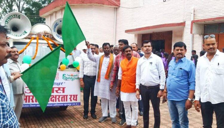 सूरजपुर/IRN.24…अंतरराष्ट्रीय साक्षरता सप्ताह का आगाज 01 सितंबर से प्रारंभ हुआ। इसके तहत सूरजपुर जिले के सभी विकास खंड में साक्षरता वातावरण निर्माण करने उल्लास नवभारत साक्षरता रथ तैयार किया गया है जो सभी विकास खंड जाएगा। जिसको प्रेमनगर विधायक भूलन सिंह मरावी व भाजपा नेता अजय गोयल के द्वारा हरी झंडी दिखाकर रवाना किया गया। इस अवसर पर सूरजपुर जिले के डीपीओ रोहित कुमार सोनी, जिला क्रीड़ाधिकारी आरती सिंह, सहायक जिला क्रीड़ा अधिकारी शरतेन्दु शुक्ला उपस्थित रहे।