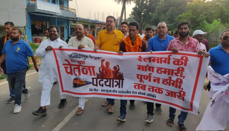 सरगुजा सर्वदलीय रेल संघर्ष समिति के बैनर तले शुक्रवार को रेणुकूट रेलवे स्टेशन से शुरू हुई अंबिकापुर-रेणुकूट रेल जुड़ाव चेतना पदयात्रा म्योरपुर, बभनी, प्रस्तावित रेलवे स्टेशन करकछी, पशुपतिपुर हुए वाड्रफनगर पहुंची जहां रात्रि विश्राम कर रविवार को चेतना पदयात्रा विकासखंड प्रतापपुर के प्रस्तावित स्टेशन डांड़करवां, देवरी तथा प्रतापपुर से चार किलोमीटर दूर स्थित मायापुर स्टेशन में पहुंची जहां पंपलेट वितरण कर हस्ताक्षर अभियान चलाया गया। इसके उपरांत चेतना पदयात्रा शाम को प्रतापपुर के खोरमा में स्थित अटल चौक पर पहुंची। जहां बड़ी संख्या में उपस्थित जनप्रतिनिधि व आमलोगों ने अंबिकापुर-रेणुकूट रेल जुड़ाव चेतना पदयात्रा में शामिल पंकज चौधरी, अजय तिवारी, मुकेश तिवारी, डा योगेश गहरवार, नितेश पाण्डेय, कमलेश सोनी, अजय शुक्ल, कैलाश मिश्रा, समीर श्रीवास्तव, मंगल पाण्डेय, अंचल ओझा व अन्य लोगों का आत्मीय स्वागत किया। उपस्थित लोगों ने चेतना पदयात्रा के माध्यम से की जा रही अंबिकापुर-रेणुकूट को रेल मार्ग से जोड़ने की मांग को अपने हस्ताक्षर कर समर्थन दिया। अंबिकापुर-रेणुकूट रेल जुड़ाव चेतना पदयात्रा पदयात्रा को लेकर प्रतापपुर वासियों में काफी उत्साह देखा गया। अटल चौक से चेतना पदयात्रा पुराना बसस्टैंड पहुंची जहां बड़ी संख्या में उपस्थित नगरवासियों को यात्रा में शामिल लोगों ने संबोधित कर अंबिकापुर-रेणुकूट रेल मार्ग के फायदे गिनाए। इसके उपरांत चेतना पदयात्रा रात्रि विश्राम के लिए स्थानीय सांस्कृतिक भवन पहुंची जहां से आज सुबह खड़गवां मार्ग से होते हुए अंबिकापुर के लिए प्रस्थान करेगी। बता दें कि प्रतापपुर क्षेत्र के रेल मार्ग से जुड़ जाने से यहां के नगर पंचायत के अलावा 101 गांवों के लोगों को लाभ मिलेगा। इस दौरान पूर्व गृहमंत्री रामसेवक पैकरा, अक्षय तिवारी, सुनील गुप्ता, अंबिका जायसवाल, अजीत शरण सिंह, थउला राम, मुकेश तायल, अवधेश पाण्डेय, योगेन्द्र सिंह, विक्रम नामदेव, प्रफुल्ल गुप्ता, आनंद शुक्ला, विक्रम प्रताप सिंह, आकाश मित्तल, विनोद श्रेष्ठ, मुन्ना जायसवाल, राजेश कश्यप, शौकत अंसारी, रामलखन सिंह व बड़ी संख्या में आमजन उपस्थित रहे।
