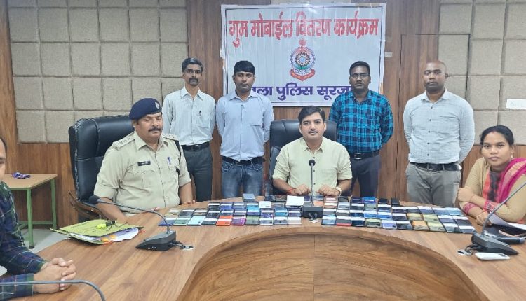 सूरजपुर। जिले से गुम हुए मोबाइलों को खोजने के लिए सूरजपुर पुलिस की ओर से विशेष अभियान चलाया गया। सोमवार 22 अगस्त 2022 को बरामद हुए 70 मोबाइलों को संबंधित व्यक्तियों को सौंपे गए। यह मोबाइल सर्विलांस में लगाकर ट्रेस किए गए थे। पुलिस अधीक्षक सूरजपुर श्री रामकृष्ण साहू के निर्देशन में गुम हुए मोबाइल को खोजने के लिए विशेष अभियान चलाया गया। जिसमें साइबर सेल को आवश्यक निर्देश दिए गए कि जो मोबाइल गुम होने संबंधी आवेदन प्राप्त हुए उनका तुरंत ही निराकरण किया जाए। जिस पर सर्विलांस में लगाकर गुम मोबाईल को ट्रेस किए गए। मोबाइल बरामद होने पर आवेदकों को उनके मोबाईल सुपुर्द किए गए।