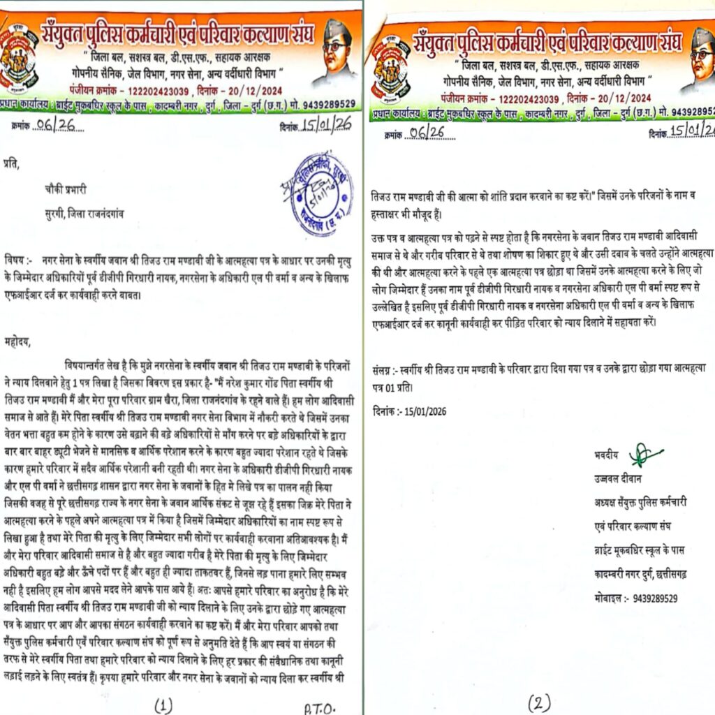 राजनंदगांव/irn.24… नगरसेना के जवान तिजउ राम मण्डावी की आत्महत्या के मामले ने तूल पकड़ लिया है अब इस मामले में सँयुक्त पुलिस कर्मचारी एवं परिवार कल्याण संघ ने मृत जवान और नगर सेना के जवानों को न्याय दिलाने के लिए मोर्चा संभाल लिया है। आपको बता दें कि 21/12/2025 को राजनांदगांव जिले में पदस्थ नगर सेना के जवान तिजउ राम मण्डावी ने पूर्व डीजीपी गिरधारी नायक और कमाण्डेन्ट लक्ष्मी प्रसाद वर्मा के खिलाफ लिखित आरोप लगाते हुए आत्महत्या कर लिया था जिसकी मर्ग जांच सुरगी पुलिस चौकी जिला राजनंदगांव के द्वारा की जा रही है। मृतक तिजउ राम मण्डावी के परिजनों ने सँयुक्त पुलिस कर्मचारी एवं परिवार कल्याण संघ के अध्यक्ष उज्जवल दीवान को पत्र लिख कर न्याय दिलाने की माँग की थी।