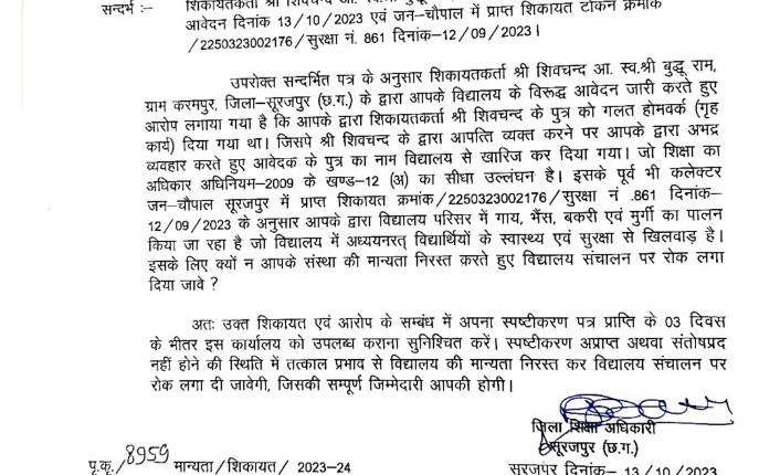 सुरजपुर- सूरजपुर जिले के ग्राम पंचायत करमपुर में आदिवासी बाल विकास विद्या मंदिर एक ऐसा विद्यालय है जहां बच्चों के स्वास्थ्य और भविष्य के साथ खिलवाड़ किया जा रहा है जहां अभिभावकों द्वारा शिक्षकों की पढ़ाई व्यवस्था को लेकर शिकायत करने पर बच्चों को विद्यालय से ही निकाल दिया जाता है एवं विद्यालय परिसर के अंदर भैंस बकरी मुर्गी आदि का पालन कर विद्यालय परिसर को फार्म हाउस बना दिया गया है ग्रामीणों द्वारा इसका विरोध करने पर ग्रामीणों को धमकाया जाता है कि हमारी पहुंच ऊपर तक की है हमारा कुछ नहीं होगा जिसकी शिकायत ग्रामीणों द्वारा सूरजपुर कलेक्ट्रेट में एवं जिला शिक्षा अधिकारी के पास किया गया था जिसमें जिला शिक्षा अधिकारी द्वारा ग्रामीणों को आश्वासन दिया गया कि ऐसे विद्यालयों पर कार्यवाही कर विद्यालय की मान्यता निरस्त की जाएगी