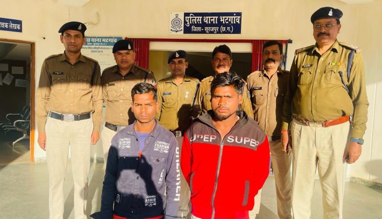 पुलिस अधीक्षक सूरजपुर श्री रामकृष्ण साहू ने मामले में संलिप्त आरोपियों की पतासाजी करते हुए जल्द गिरफ्तारी के निर्देश थाना प्रभारी भटगांव को दिए थे। अतिरिक्त पुलिस अधीक्षक मधुलिका सिंह व डीएसपी मुख्यालय नंदिनी ठाकुर के मार्गदर्शन में थाना भटगांव की पुलिस आरोपियों की धरपकड़ हेतु लगातार दबिश दे रही थी इसी बीच मुखबीर की सूचना पर घटना में संलिप्त आरोपी सुरेन्द्र राजवाड़े पिता रामकिशुन उम्र 22 वर्ष एवं गायत्री प्रसाद सोनपाकर पिता सुखदेव सोनपाकर उम्र 22 वर्ष निवासी कपसरा, थाना भटगांव को घेराबंदी कर शनिवार को पकड़ा गया। पूछताछ पर आरोपियों ने घटना को अंजाम देना स्वीकार किया, मामले में दोनों आरोपियों को गिरफ्तार किया गया, अन्य आरोपियों की पतासाजी की जा रही है। इस कार्यवाही में थाना प्रभारी भटगांव शरद चंद्रा, एसआई सी.पी.तिवारी, बृजमोहन गुप्ता, प्रधान आरक्षक संजय चौहान, आरक्षक रजनीश पटेल, प्रकाश साहू, नौशाद खान, ताराचंद यादव व संतोष जायसवाल सक्रिय रहे।
