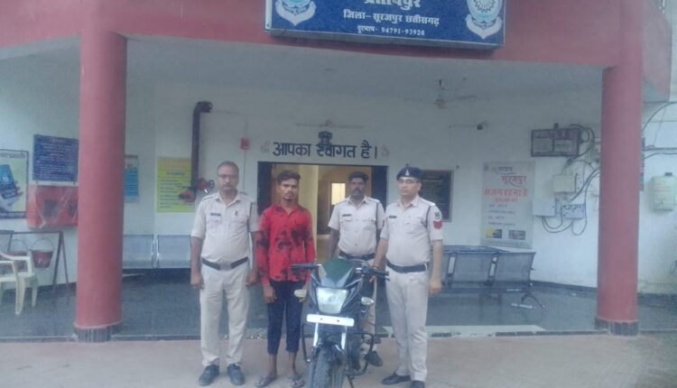 सूरजपुर/IRN.24… डीआईजी व एसएसपी सूरजपुर श्री एम.आर.आहिरे (भा.पु.से.) ने थाना-चौकी प्रभारियों को चोरी की घटनाओं पर अंकुश लगाने, आपराधिक प्रवृत्ति के लोगों पर पैनी नजर रखने एवं सूचना तंत्र को मजबूत करने के निर्देश दिए थे। इसी परिप्रेक्ष्य में दिनांक 31.08.24 को थाना प्रतापपुर जांच कार्यवाही व ग्राम भ्रमण पर निकली थी इसी बीच मुखबीर से सूचना मिली कि ग्राम मायापुर मयूरगोड़ी में ग्राम चिकनी का दिलीप सिंह नाम का व्यक्ति मोटर सायकल हीरो होण्डा पैसन प्रो सीजी 15 सीएफ 5061 को मात्र 2 हजार रूपये में बिक्री करने के लिए ग्राहक की तलाश में लगा हुआ है।