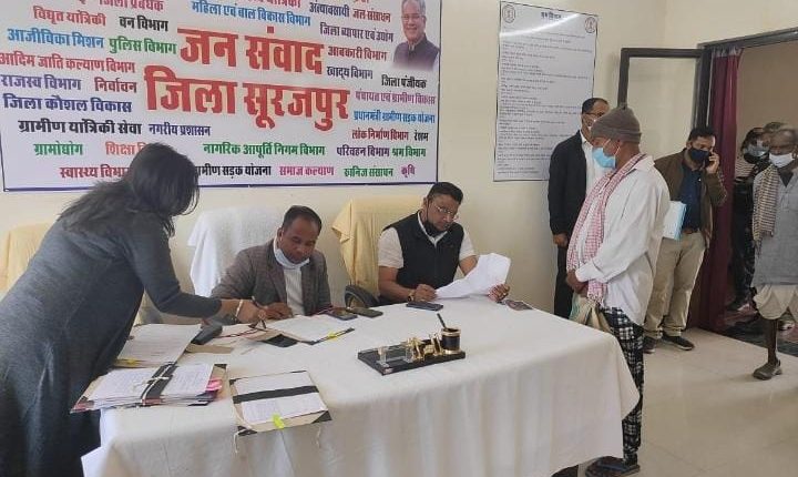 सूरजपुर – कलेक्टर डॉ. गौरव कुमार सिंह एवं पुलिस अधीक्षक श्री राजेश अग्रवाल ने आज जिला कलेक्टोरेट में स्थित जन संवाद कक्ष में विभिन्न मांगो एवं समस्याओं को लेकर जनसंवाद कक्ष में पहुंचे ग्रामीणोंजनो की आवेदनों का अवलोकन किया एवं संबंधित अधिकारियों को समस्याओं व मांगों को त्वरित निराकरण करने निर्देश दिए।
