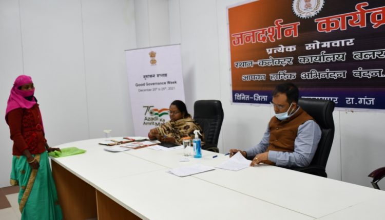 बलरामपुर कलेक्टर कुंदन कुमार ने आमजनों के समस्याओं का प्राथमिकता के साथ व शीघ्र निराकरण करने के उद्देश्य से जिले में प्रत्येक सोमवार को जनदर्शन आयोजन किया जाता है। इसी कड़ी में संयुक्त जिला कार्यालय भवन में कलेक्टर कुन्दन कुमार ने जनदर्शन में आम जनता के विभिन्न मांगों और समस्याओं को सुना तथा संबंधित विभागीय अधिकारियों को प्रेषित करते हुए तत्काल निराकरण करने के निर्देश दिये। कलेक्टर जनदर्शन में विकासखण्ड शंकरगढ़ के ग्राम दोहना की ज्योति किरण द्वारा भूमि संबंधी, ग्राम सनावल तहसील रामचन्द्रपुर के परसु सरूता द्वारा ग्राम पंचायत सनावल हल्का नम्बर 04 पटवारी विजय यादव के द्वारा धान का रकबा में हेरा-फेरी के संबंध में शिकायत, नगर पंचायत बलरामपुर की सुशीला गुप्ता कार्य से नहीं हटाने के संबंध में तथा ग्राम पंचायत आरा के हितग्राहियों द्वारा नवीन राशन कार्ड का जांच प्रतिवेदन अपात्र घोषित होने पर पुनः जांच हेतु आवेदन प्रस्तुत किया गया। कलेक्टर कुन्दन कुमार ने संबंधित विभाग के अधिकारियों से प्राप्त आवेदनों पर त्वरित कार्यवाही करने के निर्देश दिये। जनदर्शन कार्यक्रम से आम जनों की समस्याओं का समाधान मिल रहा है
