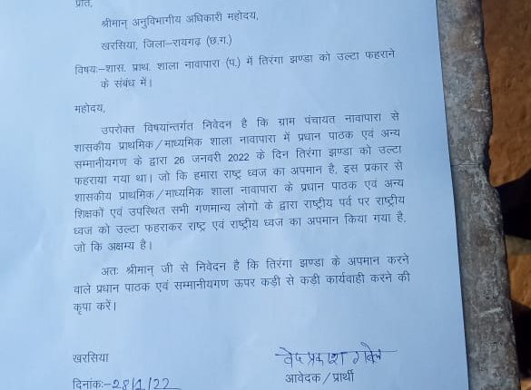 इस संबंध में मिली जानकारी के अनुसार रायगढ़ जिले के खरसिया विधानसभा क्षेत्र के अंतर्गत आने वाले ग्राम नवापारा में 73 वें गणतंत्र दिवस के अवसर पर शासकीय प्राथमिक माध्यमिक शाला नावापारा में प्रधान पाठक एवं अन्य सम्मानीयगणों की उपस्थिति में तिरंगा झंडा का उल्टा फहराया गया था, जो कि राष्ट्र ध्वज का अपमान की श्रेणी में आता है।