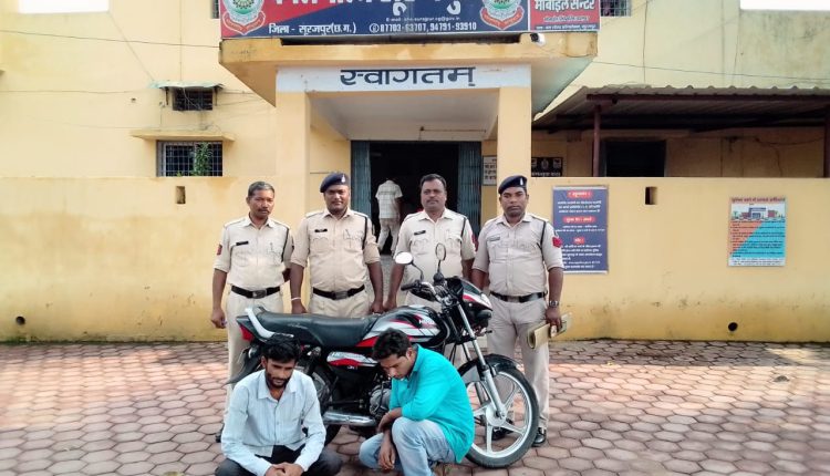 पुलिस अधीक्षक सूरजपुर ने मोटर सायकल चोर की पतासाजी कर जल्द गिरफ्तार करने के निर्देश थाना प्रभारी को दिए। अतिरिक्त पुलिस अधीक्षक हरीश राठौर व एसडीओपी सूरजपुर गीता वाघवानी के मार्गदर्शन में थाना सूरजपुर की पुलिस ने मंगलवार को मुखबीर की सूचना पर संदेही सवि लाल जायसवाल उर्फ होण्डा पिता स्व. चित्र प्रसाद 30 वर्ष ग्राम गजाधरपुर को पकड़ा। पूछताछ पर उसने बताया ने अपने साथी मोईनउद्दीन उर्फ चरकू के साथ मिलकर मोटर सायकल को चोरी करना स्वीकार किया जिसके बाद आरोपी मोईनउद्दीन उर्फ चरकू पिता नजीमउद्दीन उम्र 26 वर्ष निवासी ग्राम करवां, चौकी लटोरी को पकड़ा गया। आरोपियों के निशानदेही पर चोरी की मोटर सायकल कीमत 30 हजार रूपये को बरामद कर दोनों आरोपियों को गिरफ्तार किया गया। इस कार्यवाही में थाना प्रभारी सूरजपुर प्रकाश राठौर, प्रधान आरक्षक ऐसन पाल, आरक्षक राजकुमार पासवान व सैनिक जहांगीर आलम सक्रिय रहे।