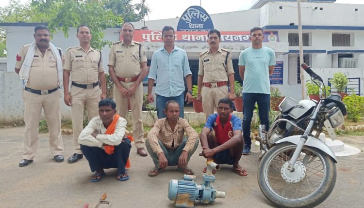 पुलिस अधीक्षक श्री रामकृष्ण साहू ने अज्ञात चोर की पतासाजी कर जल्द गिरफ्तार करने के निर्देश दिए। अतिरिक्त पुलिस अधीक्षक हरीश राठौर मार्गदर्शन में थाना जयनगर की पुलिस आरोपी की पतासाजी में लगी थी कि मुखबीर से सूचना मिला कि गांव के ही भूलन राम राजवाड़े, रामरूप बिंझिया व राकेश राजवाड़े चोरी की टूल्लू पम्प बिक्री करने ग्राहक की तलाश कर रहे है। पुलिस ने तीनों संदेहियों को दबिश देकर पकड़ा, पूछताछ पर आरोपियों ने एक राय होकर टूल्लू बिजली पम्प चोरी करना स्वीकार किया। आरोपियों के निशानदेही पर 1 नग डेढ एचपी का टूल्लू बिजली पम्प कीमत 11400 रूपये का बरामद कर तीनों आरोपियों को गिरफ्तार किया गया। इस कार्यवाही में थाना प्रभारी जयनगर सुभाष कुजूर, एएसआई वरूण तिवारी, प्रधान आरक्षक शिव राजवाड़े, अशोक साहू, आरक्षक विकास मिश्रा, मितेश मिश्रा, विवेक विश्वकर्मा व आरक्षक सोनू सक्रिय रहे।