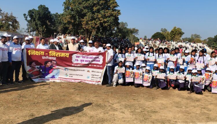 सूरजपुर/IRN.24… कलेक्टर श्री एस० जयवर्धन के निर्देशन में 100 दिवत्तीय निक्षय निरामय अभियान के अंतर्गत ग्राम कंदरई में अखिल भारतीय स्तरीय नांक आउट फुटबॉल प्रतियोगिता के दौरान ग्राम के सभी स्कूली छात्राओं के द्वारा निक्षय निरामय अभियान एवं सामूहिक दवा सेवन गतिविधि (एमडीए) की जागरूकता हेतु टी-शर्ट एवं टोपी के साथ पूरे मैदान में भ्रमण कर लोगों को जागरूक किया गया। साथ में जन समुदाय को पाम्पलेट, पोस्टर के माध्यम से जागरूक किया गया है. जिसमें भारी संख्या में लोग इस कार्यक्रम में सम्मिलित रहे। कार्यक्रम की अध्यक्षता डॉ० जे०एस०आक तरूता जिला क्षय अधिकारी, डॉ० प्रिंस जायसवाल जिला कार्यक्रम प्रबंधक एन०एच०एम०, फुटबाल प्रतियोगिता समिति के अध्यक्ष श्री नरसिंह नारायण, वरिष्ठ रेफरी श्री राम बहादुर लाम्बा, डॉ० अमित मगत खण्ड चिकित्सा अधिकारी, डॉ० प्रेम प्रकाश खलखो प्रभारी चिकित्सा अधिकारी प्रा०स्वा०केन्द्र कंदरई, डॉ० गौरव सकता एवं विभाग के अन्य अधिकारी/कर्मचारियों उपस्थित रहे।
