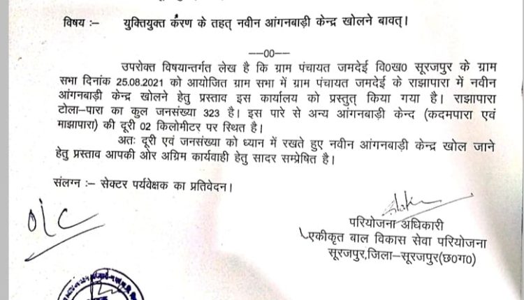 सूरजपुर- जमदेई के राझापारा मोहल्ले में आंगनबाड़ी केंद्र नहीं होने के कारण गर्भवती माताओं एवं छोटे बच्चों को काफी परेशानियों का सामना करना पड़ रहा है। इसकी सूचना ग्राम पंचायत ने कार्यालय परियोजना अधिकारी एकीकृत बाल विकास सेवा परियोजना सूरजपुर को ग्राम पंचायत के द्वारा प्रस्ताव बनाकर प्रेषित की दिनांक 28/05/2021 को उक्त विषय पर लेकिन आज तक कोई कार्यवाही नहीं हुई नाही आंगनबाड़ी केंद्र बनी। जिसकी वजह से गर्भवती माताओं को काफी परेशानियों का सामना करना पड़ रहा है। इस मोहल्ले से कदमपारा आंगनबाड़ी वाह माझापारा आंगनबाड़ी केंद्र लगभग 2 किलोमीटर दूर है इसी वजह से नवीन आंगनबाड़ी केंद्र की मांग मोहल्ले वासियों ने सरपंच के माध्यम से बाल विकास परियोजना अधिकारी सूरजपुर को पहुंचाया जिस पर आज तक कोई कार्यवाही नहीं हुई नाही आंगनबाड़ी केंद्र बनी। सेक्टर प्रवेशक सेक्टर 15 बाल विकास परियोजना सूरजपुर जिला सूरजपुर छत्तीसगढ़ के द्वारा सर्वे करने पर पाया गया कि यहां नवीन आंगनबाड़ी केंद्र की जरूरत है फिर भी आज तक आंगनबाड़ी केंद्र नहीं बन पाया।