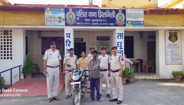 अतिरिक्त पुलिस अधीक्षक हरीश राठौर व एसडीओपी ओड़गी राजेश जोशी के मार्गदर्शन में पुलिस मोटर सायकल चोर की पतासाजी में लगी थी इसी बीच थाना झिलमिली की पुलिस ने मुखबीर की सूचना पर सेमरसोत, जिला बलरामपुर में चोरी की मोटर सायकल लेकर भागने के दौरान आरोपी देव राजवाड़े पिता मंगल राजवाड़े उम्र 38 वर्ष निवासी केनापारा, थाना जयनगर को पकड़ा गया, पूछताछ पर उसने मोटर सायकल चोरी करना स्वीकार किया। मामले में मोटर सायकल कीमत 50 हजार रूपये का जप्त कर आरोपी को गिरफ्तार किया गया। इस कार्यवाही में थाना प्रभारी झिलमिली सी.पी.तिवारी, एएसआई धनेश्वर कुशवाहा, आरक्षक दिनेश ठाकुर, नोबिन, चन्द्रदेव मरावी सक्रिय रहे।