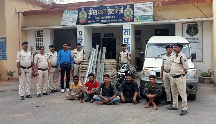 पुलिस अधीक्षक सूरजपुर आई कल्याण एलिसेला (भा.पु.से.) ने अज्ञात चोर की पतासाजी कर जल्द गिरफ्तार करने के निर्देश थाना प्रभारी झिलमिली को दिया। अतिरिक्त पुलिस अधीक्षक मधुलिका सिंह व एसडीओपी ओड़गी राजेश जोशी के मार्गदर्शन में थाना झिलमिली पुलिस के द्वारा अज्ञात आरोपी की पतासाजी करने के दौरान मुखबीर की सूचना पर भैयाथान चौक में एक सफेद रंग की बोलेरो वाहन को चेक किया गया जिसमें लोहे का सेट्रिंग प्लेट व लोहे का टावर एंगल लोड़ पाया गया, चालक रामलाल दुबे उर्फ मनोज पिता स्व. प्यारेलाल दुबे उम्र 24 वर्ष निवासी ग्राम डकईपारा, थाना पटना जिला कोरिया से हिकमत अमली से पूछताछ करने पर उसने बताया कि अपने साथियों के साथ मिलकर दोनों स्थानों से चोरी की वारदात को अंजाम दिये, जिसके बाद पुलिस ने आरोपी सुरेश तिवारी उर्फ मोटू पिता परमेश्वर तिवारी उम्र 23 वर्ष ग्राम कोरंधा, थाना लुण्ड्रा, जिला सरगुजा, सुमेश्वर सिंह उर्फ सुदामा पिता बिहारी सिंह उम्र 19 वर्ष ग्राम संबलपुर, थाना जयनगर, मनोज उर्फ थलेश्वर पेंकरा पिता साहित राम उम्र 22 वर्ष ग्राम डकईपारा, थाना पटना व हरिराम पैंकरा पिता सुखदेव पैंकरा उम्र 23 वर्ष ग्राम डकईपारा, थाना पटना को पकड़ा। दोनों मामले में पुलिस ने चोरी का 28 नग एंगल व 27 नग सेन्ट्रिंग प्लेट कुल कीमत 1 लाख 21 हजार रूपये व घटना में प्रयुक्त बोलेरो वाहन व एक मोटर सायकल जप्त कर आरोपियों को गिरफ्तार किया है। इस कार्यवाही में थाना प्रभारी झिलमिली नरेन्द्र सिंह, एसआई हिम्मत सिंह शेखावत, एएसआई पास्कल लकड़ा, प्रधान आरक्षक महेन्द्र यादव, अलबिनुस तिर्की, आरक्षक राकेश सिंह, हेमन्त सिंह, भीमेश आर्मो, अवधेश पैंकरा सक्रिय रहे।