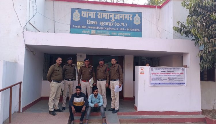 मामले की सूचना पर पुलिस अधीक्षक सूरजपुर श्री रामकृष्ण साहू (भा.पु.से.) ने चोरी की वारदात को अंजाम देने वाले आरोपियों को जल्द पकड़ने के निर्देश थाना प्रभारी को दिए थे। अतिरिक्त पुलिस अधीक्षक मधुलिका सिंह व एसडीओपी प्रेमनगर प्रकाश सोनी के मार्गदर्शन में थाना रामानुजनगर की पुलिस चोर की पतासाजी कर रही थी इसी बीच मुखबीर से प्राप्त सूचना के आधार पर संदेही कटघोरा के इन्द्रपाल साहू व संदीप साहू को दबिश देकर पकड़ा गया। पूछताछ पर आरोपियों ने बताया कि चोरी की इस वारदात को अपने अन्य साथियों के साथ मिलकर अंजाम देना स्वीकार किया। दोनों आरोपियों के निशानदेही पर 78 नग सेन्ट्रिंग प्लेट कीमत 39 हजार रूपये को बरामद कर आरोपी इन्द्रपाल साहू पिता जीवन लाल साहू उम्र 19 वर्ष निवासी जटगा, चैकी जटगा, थाना कटघोरा, जिला कोरबा एवं संदीप साहू पिता लक्ष्मी प्रसाद साहू उम्र 19 वर्ष निवासी ढेलवाडीह, थाना कटघोरा, जिला कोरबा को गिरफ्तार किया गया। पुलिस मामले में फरार आरोपियों की पतासाजी में लगी हुई है। इस कार्यवाही में थाना प्रभारी रामानुजनगर बिपिन लकड़ा, एएसआई बिसुनदेव पैंकरा, माधव सिंह, प्रधान आरक्षक हंसराम कनेडिया, आरक्षक दीपक यादव, धनंजय साहू, रविशंकर साहू, चन्द्रकुमार साहू, सैनिक मानसाय सिंह, पंकज पटेल व देवचंद पाण्डेय सक्रिय रहे।