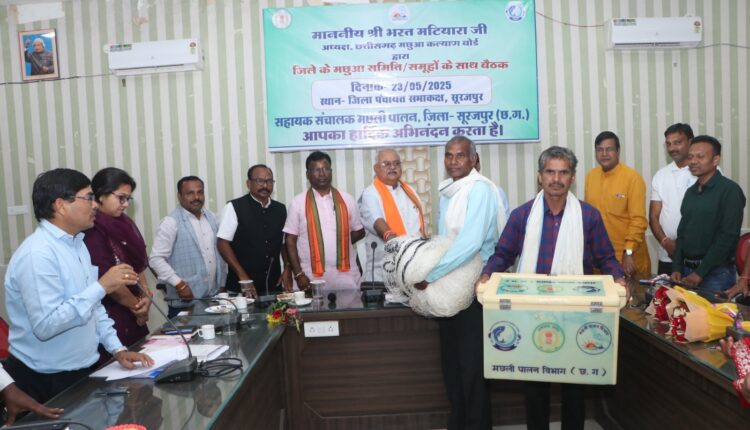 सूरजपुर/IRN.24…/ छत्तीसगढ़ मछुआ कल्याण बोर्ड के अध्यक्ष श्री भरत मटियारा ने आज जिला पंचायत के सभा कक्ष में जिले के मछुवारा वर्ग, सहकारी समितियों एवं मत्स्य पालकों के साथ एक महत्वपूर्ण बैठक की। बैठक में मछुआरों के कल्याण से जुड़ी विभिन्न योजनाओं और मुद्दों पर व्यापक चर्चा की गई।बोर्ड के अध्यक्ष श्री मटियार ने बैठक में मछली पालन विभाग अंतर्गत प्रधानमंत्री मत्स्य सम्पदा योजना, सहित अन्य योजनाओं की समीक्षा की तथा उपस्थित मत्स्य कृषकों को विभागीय योजनाओं का लाभ उठाकर मत्स्य उत्पादन में वृद्धि कर आय दुगनी करने हेतु प्रोत्साहित किया। उन्होंने संबंधित अधिकारियों को सुशासन तिहार के माध्यम से शासन की जनकल्याणकारी योजनाओं की जानकारी सभी मत्स्य कृषको सहित अन्य नागरिकों तक पहुँचाने कहा। उन्होंने उपस्थित मत्स्य कृषकों से विभागीय योजनाओं का लाभ लेकर अपनी आर्थिक में सुधार के लिए कहा। बैठक में उन्होंने जिले के सभी मछुआ सहकारी समितियों की मांगें और समस्याएं सुनी और उनके निराकरण का आश्वासन दिया।इस बैठक में सहायक संचालक मत्स्य श्री एम एस सोनवानी ने विभाग के गतिविधियों से श्री मटियारा को अवगत कराया। उन्होंने प्रधानमंत्री मत्स्य संपदा योजना, सहकार से समृद्धि योजना, धरती आबा जनजातियां ग्राम उत्कर्ष अभियान अंतर्गत प्रस्तावित कार्ययोजना, किसान क्रेडिट कार्ड की प्रगति के सम्बन्ध में जानकारी देते हुए बताया कि किसानों को किस प्रकार से लाभान्वित किया जा रहा है। उन्होंने जिले में मत्स्य बीज प्रक्षेत्र बसदेई के अंतर्गत उपलब्ध संसाधनों सर्कुलर हैचरी, प्रजनक पोखर, संवर्धन पोखर, एम बी पैकिंग शेड, भंडार कक्ष की जानकारी दी।इसके अलावा सहकारी समिति के आए हुए सदस्यो से अध्यक्ष श्री मटियारा ने बातचीत कर उनके द्वारा मत्स्य उत्पादन में दिए योगदान के सम्बन्ध में जानकारी ली। उन्होंने उन्हें मिलने वाले लाभ एवम किसी भी प्रकार की समस्याओं के संबंध में जानकारी ली। श्री मटियारा ने बैठक में उपस्थित सभी समूहों को समिति बनाने के लिए कहा। ताकि योजनाओं का लाभ बेहतर रूप में मिल सके। उन्होंने मत्स्य संपदा योजना अंतर्गत लाभ प्रदान करने के लिए निर्देशित किया । इस दौरान उन्होंने मछुआरों को आने वाली समस्याओं को लेकर भी शीघ्र समाधान के लिए आवश्यक कार्यवाही करने के लिए कहा।विधायक श्री भूलन सिंह मरावी ने भी कार्यक्रम को संबोधित करते हुए मछली पालन को रोजगार का सशक्त माध्यम बताया। उन्होंने सफल मछुआरों के अनुभव से प्रेरणा लेकर अन्य युवाओं को इस व्यवसाय से जुड़ने का आह्वान किया।बैठक में कलेक्टर श्री एस. जयवर्धन ने मत्स्य पालन को व्यावसायिक रूप से अपनाने की आवश्यकता पर बल दिया। उन्होंने कहा कि इससे न के