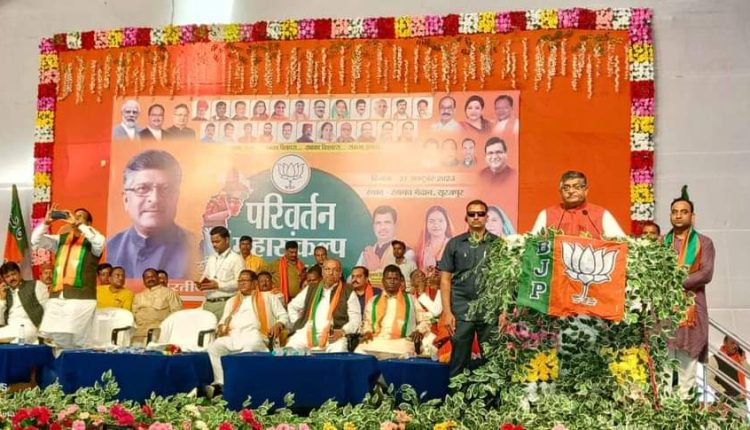 प्रभेष मिश्रा सूरजपुर – सूरजपुर / भाजपा प्रत्याशियों के नामांकन रैली को संबोधित करते हुए केन्द्रीय मंत्री रविशंकर प्रसाद ने कहा कि छत्तीसगढ़ राज्य निर्माण कर भाजपा ने इसे बीमारु प्रदेश से विकसित राज्य बनाया था हम काम करने वाले लोग हैं लूटने वाले नहीं । उन्होंने प्रदेश की भुपेश सरकार को आड़े हाथों लेते हुए कहा कि कांग्रेस ने इस प्रदेश को सिर्फ लूटने का काम किया है । यहां कोयला शराब नियुक्ति धान गौठान में घोटाला किया गया नदियों का बालू का घोटाला किया गया इस सरकार में हर जगह लूट मची है उन्होंने कहा कि चुनाव के समय है तो भुपेश बघेल किसानों की कर्ज माफी का झुठा वादा करते हैं । उन्होंने सावल किया कि पांच साल सरकार में रहे तब क्यों नहीं किसानों की कर्ज माफी किया कांग्रेस सरकार के झुठे वादे में नहीं आना है । उन्होंने कहा कि हमे तय करना है कि झुठे वादे करने वाली सरकार चाहिए या छत्तीसगढ़ के विकास करने वाली सरकार चाहिए छत्तीसगढ़ का विकास तभी होगा जब लूट का बाजार बंद होगा इसके लिए भुपेश सरकार की विदाई करनी होगी । भाजपा के नामांकन रैली में पहुंचे केन्द्रीय मंत्री रविशंकर प्रसाद का रंगमंच मैदान में जोरदार स्वागत किया गया स्वागत से अभिभूत पूर्व केंद्रीय मंत्री ने सूरजपुर जिले के प्रतापपुर भाजपा प्रत्याशी शकुंतला सिंह पोर्ते भटगांव विधानसभा प्रत्याशी लक्ष्मी राजवाड़े व प्रेमनगर भाजपा प्रत्याशी भुलन सिंह मरावी को मंच में खड़ा कर उपस्थितिजानो से आशीर्वाद देने की अपील की उन्होंने कहा कि छत्तीसगढ़ राज्य का निर्माण भाजपा ने किया है सूरजपुर जिले का भी निर्माण भाजपा ने ही किया है। प्रदेश में भाजपा की सरकार रही तो यह प्रदेश विकसित राज्य की ओर अग्रसर रहेगा भाजपा की सरकार आते ही छत्तीसगढ़ को विकसित राज्य बनाया जाएगा । भाजपा काम करने वाली पार्टी है न कि लूटने वाली है। उन्होंने कहा कि देश कि मोदी सरकार ने कश्मीर से धारा 370 हटाने का एतिहासिक काम किया। देश से आतंकवाद का कमर तोड कर रख दिया है । आज भारत की अर्थव्यवस्था दुनिया की पांचवीं अर्थव्यवस्था में है बहुत ही जल्द तीसरे स्थान पर आ जाएगी उन्होंने कहा कि मोदी सरकार विधानसभा एवं लोकसभा में 33% आरक्षण देकर महिलाओं का मन सम्मान बढ़ाया है और बेटी बचाओ अभियान के तहत काम हो रहे स्वच्छता व शौचालय की दिशा में तेजी से काम हुए हैं । प्रधानमंत्री नरेन्द्र मोदी के नेतृत्व में देश मजबूती के साथ आगे बढ़ रहा है उन्होंने कहा कि मोदी की सरकार में आतंकवाद की कोशिश भी करोगे तो पकड़े जाओगे मरे जाओगे मोदी जी जो कहते है वे करते भी हैं। आज तक इस सरकार में कोई भी दाग नहीं लगा है। पूर्व केंद्रीय मंत्री ने कांग्रेस पर निशाना साधते हुए कहा कि इन लोग संनातन धर्म का अपमान 
