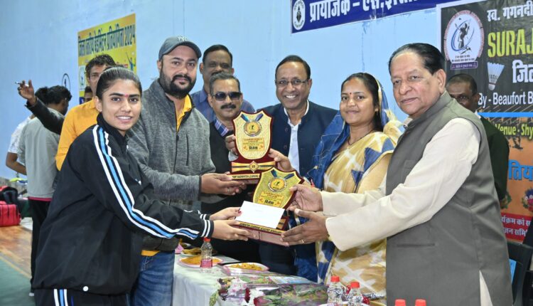 सूरजपुर/IRN.24…जिला बैडमिंटन संघ सूरजपुर के तत्वावधान में आयोजित स्व गगनदीप बग्गा एवं स्व गगन राय के स्मृति में आयोजित सूरजपुर ओपेन बैडमिंटन कप 2024 का फाइनल मैच डॉक्टर श्यामा प्रसाद मुखर्जी स्पोर्ट्स कॉम्प्लेक्स में पुरुष वर्ग में रायपुर व दुर्ग टीम के मध्य खेला गया जिसमें दुर्ग की टीम विजयी रही तथा महिला वर्ग में आयुषी दीवान तथा समृद्धि जायसवाल के मध्य खेला गया जिसमें आयुषी दीवान विजयी रही !प्रतिभागियों को मुख्य अतिथि केबिनेट मंत्री लक्ष्मी राजवाड़े के हाथों पुरुष्कार वितरण किया गया इस अवसर पर खिलाड़ियों तथा उपस्थितों को मंत्री जी ने खेल के महत्व के बारे में बताया तथा कहा कि खेल खेलने के कई फायदे है इससे शारिरिक व मानसिक रूप से स्वस्थ रहते है हैतथा आपसी भाईचारा बढ़ता है इस अवसर पर अनिल गोयल संदीप अग्रवाल डीएसपी राम श्रृंगार यादव लाल चंद अग्रवाल प्रमोद तायल एस सी मुखर्जी विनय गुप्ता उपस्थित रहे