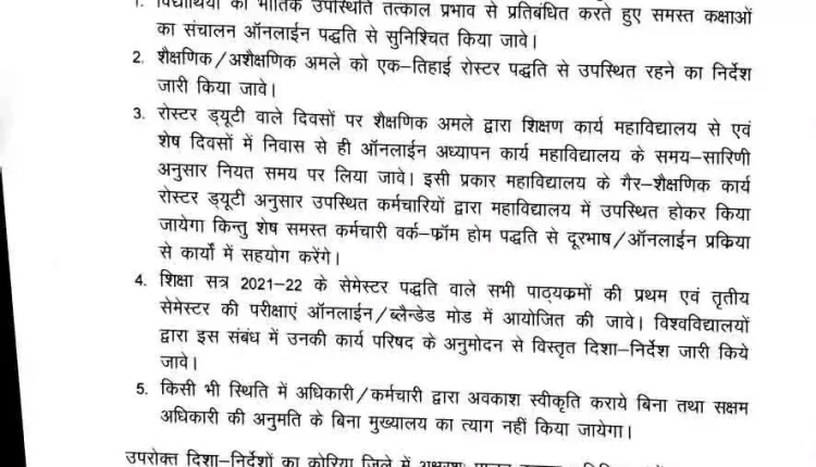 दिशा-निर्देशों में कहा गया था कि महाविद्यालय के गैर-शैक्षणिक कार्य रोस्टर ड्यूटी अनुसार उपस्थित कर्मचारियों द्वारा महाविद्यालय में उपस्थित होकर किया जायेगा किन्तु शेष समस्त कर्मचारी वर्क फ्रॉम होम पद्धति से दूरभाष तथा ऑनलाईन प्रक्रिया से कार्यों में सहयोग करेंगे। किसी भी स्थिति में अधिकारी-कर्मचारी द्वारा अवकाश स्वीकृति कराये बिना तथा सक्षम अधिकारी की अनुमति के बिना मुख्यालय का त्याग नहीं किया जायेगा।
