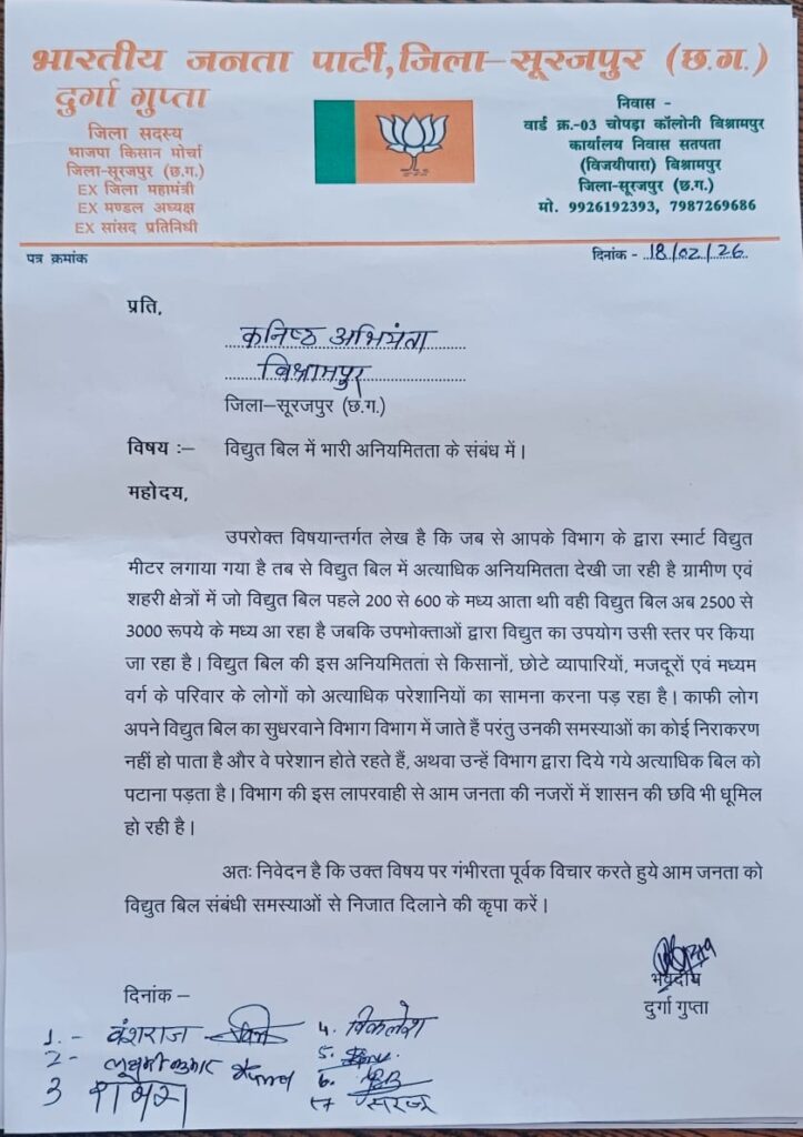 विश्रामपुर/irn.24… निवर्तमान जिला महामंत्री व जिला सदस्य, भाजपा किसान मोर्चा, दुर्गा गुप्ता ने विद्युत बिलों में हो रही भारी अनियमितताओं के संबंध में कनिष्ठ अभियंता को ज्ञापन सौंपा। ज्ञापन में उन्होंने कहा कि जब से विभाग द्वारा स्मार्ट विद्युत मीटर लगाए गए हैं, तब से ग्रामीण एवं शहरी क्षेत्रों में बिजली बिलों में अत्यधिक वृद्धि और अनियमितता देखने को मिल रही है।