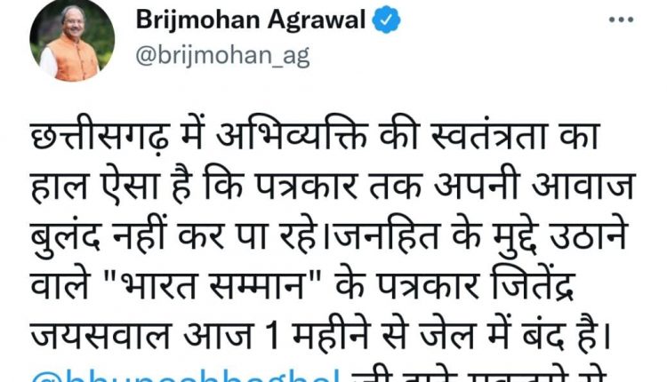 अम्बिकापुर: आज पत्रकारों द्वारा पत्रकार सुरक्षा कानून लागू करने तथा जेल में बंद पत्रकार साथियों को रिहा करने की मांग को लेकर जेल भरो आंदोलन का आगाज किया गया है। जिसकी शुरुआत अंबिकापुर से की गई है। आपको बता दें की दैनिक समाचार पत्र के संपादक जितेंद्र कुमार को फर्जी मामलों में एफ आई आर दर्ज कर जेल भेजे हुए लगभग 1 महीने का समय हो चुका है पर अभी भी सरकार द्वारा उनकी रिहाई को लेकर कोई भी संतोषजनक कार्यवाही नहीं की गई।इसी मामले में बीजेपी के वरिष्ठ नेता बृजमोहन अग्रवाल ने ट्वीट कर इसकी घोर निंदा करते हुए भूपेश बघेल पर निशाना साधा है।
