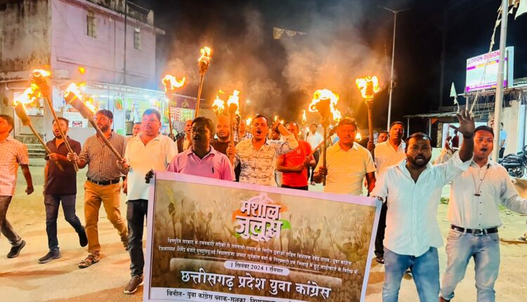 सूरजपुर/भटगांव IRN.24… प्रदेश युवा कांग्रेस छत्तीसगढ़ के निर्देशानुसार आज पूरे प्रदेश में 1 सितंबर 2024 को प्रदेश की भाजपा सरकार द्वारा विधायक देवेंद्र यादव,युवा कांग्रेस जिला अध्यक्ष शैलेंद्र बंजारे,एन एस यू आई विधानसभा अध्यक्ष एवं सतनामी समाज के साथियों को झूठे केस में फसा कर जेल भेजे जाने की विरोध में युवा कांग्रेस के नेतृत्व में विधानसभा मुख्यलय भटगांव में मशाल जुलूस निकालकर विरोध दर्ज कराया गया।