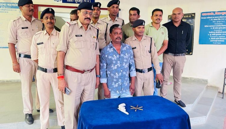 अतिरिक्त पुलिस अधीक्षक मधुलिका सिंह व एसडीओपी प्रतापपुर अमोलक सिंह के मार्गदर्शन में थाना भटगांव की पुलिस टीम के द्वारा भटगांव मिशन चौक पर घेराबंदी कर दिनकर सिंह पिता स्व. कामेश्वर सिंह निवासी वार्ड क्रमांक 10 भटगांव को पकड़ा गया जिसके कब्जे से एक देशी कट्टा 315 बोर एवं जिंदा कारतुस 06 नग जप्त कर धारा 25, 27 आर्म्स एक्ट के तहत कार्यवाही करते हुए गिरफ्तार किया गया। इस कार्यवाही में थाना प्रभारी भटगांव शरद चन्द्रा, एसआई सी.पी.तिवारी, प्रधान आरक्षक संजय कुमार, आरक्षक रजनीश पटेल, मनोज जायसवाल, कमलेश्वर सिंह, मिथलेश गुप्ता, प्रहलाद पैंकरा, प्रकाश साहू व मोहम्मद नौशाद सक्रिय रहे।