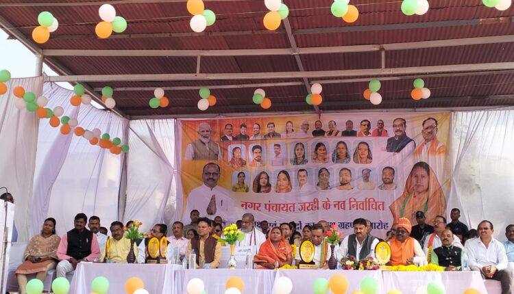 सूरजपुर/जरही(IRN.24…)नगर पंचायत जरही में नवनिर्वाचित पार्षदों सहित नपं अध्यक्ष का शपथ ग्रहण समारोह आयोजित किया गया। जरही के दुर्गा पंडाल स्थित मैदान में शैला नृत्य, भोज के साथ नपं जरही द्वारा भव्य आयोजन के साथ नवनिर्वाचित पार्षदों एवं अध्यक्ष पद के लिए शपथ ग्रहण समारोह आयोजित किया गया । समारोह में जिले के अपर कलेक्टर जगन्नाथ वर्मा के द्वारा जनप्रतिनिधियों को शपथ दिलाई गई और नपं के अधिकारी कर्मचारियों द्वारा अतिथियों का सम्मान किया गया नगरीय निकाय चुनाव के बाद जरही की जनता को शपथ ग्रहण समारोह का इंतजार था जो रविवार को समाप्त हुआ। जरही के नव निर्वाचित 15 पार्षदों को शपथ दिलाई गई वहीं नगर पंचायत अध्यक्ष पूरन राम राजवाडे ने अध्यक्ष पद के लिए शपथ ग्रहण किया इस दौरान विधायक श्रीमति शकुन्तला सिंह जी,अजय गोयल , शशि गर्ग , अशोक सिंह ,जरही की नायब तहसीलदार सरिता राजवाड़े,नपं के सीएमओ एम एल गहरवरिया, अनुज सिन्हा, देवेंद्र पटेल, अभिषेक जयसवाल, मुन्ना लाल राजवाड़े भाजपा के अजय गोयल, शशिकांत गर्ग,भाजपा महामंत्री अशोक गुप्ता, हीरा लाल गोयल, दसरथ सिंह तेज बहादुर सिंह, सरिता गुप्ता , किरण गुप्ता, मीना श्रीवास्तव,शशि सिंह, राकेश शुक्ला, विकेश जयसवाल, रविंद्र जायसवाल, संजय सिंह, दिलीप मंडल,प्रताप मरावी, विनीत देवांगन,गुडु सिंह ,शरद चंद द्विवेदी ,हिमांशु सिंह , प्रवीण सिंह ,दशरत सिंह, रंजन कुमार मंडल, मुकेश सिंह,प्रकाश राजवाड़े सहित जरही के नागरिक गण उपस्थित रहे।