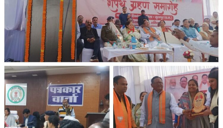 सूरजपुर/IRN.24…—बहुलम्बित मांग और भाजपा सरकार के एक वर्ष पूर्ण करने के साथ ही सूरजपुर जिले के शिवनन्दनपुर को नगर पंचायत की मांग काफी समय से लंबित थी जिसे क्षेत्र की विधायक व कैबिनेट में मंत्री श्रीमती लक्ष्मी राजवाड़े के द्वारा प्रदेश के मुख्यमंत्री विष्णुदेव साय के समक्ष मांग रखी गई थी जिसे मंत्री लक्ष्मी राजवाड़े ने अपने अथक प्रयास से शिवनन्दनपुर को नगरपंचायत का दर्जा दिलाने के साथ आज अध्यक्ष और सदस्यों को शपथ दिलाया साथ ही क्षेत्र वासियों को आशवासन भी दिलाया कि विकास कार्यों में तेजी लाया जाएगा तथा नगर पंचायत शिवनन्दनपुर के विकास के लिए हर सम्भव मदद किया जाएगा इस कार्यक्रम में पूर्व गृहमंत्री रामसेवक पैकरा भाजपा जिलाध्यक्ष श्रीबाबुलाल अग्रवाल पूर्व विधायक भटगांव श्रीमती रजनी त्रिपाठी वरिष्ट भजपा नेता श्रीचरण सिंह अग्रवाल बनारसी जायसवाल राजेश यादव ललित गोयल अशोक अग्रवाल रितेश जायसवाल मनमत बछाड भोला सिंह देव धन बिंझिया सहित मनोनीत अध्यक्ष व सभी सदस्य तथा स्थानीय नागरिक उपस्थित रहे