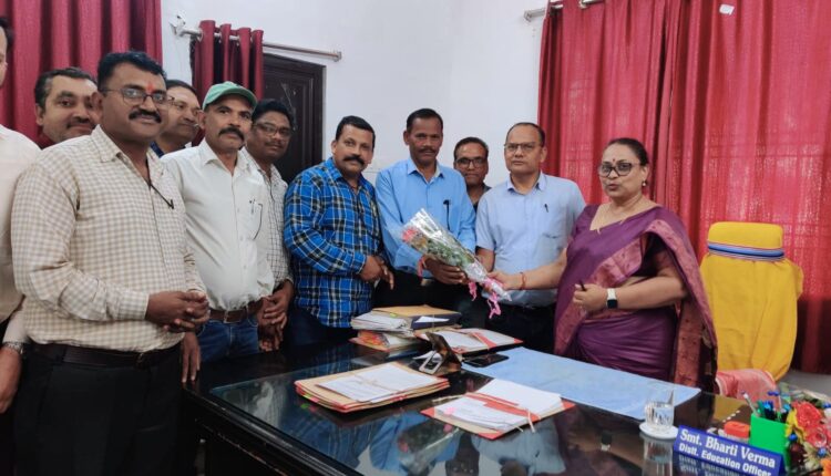सूरजपुर/(IRN.24…)- जिले में नव पदस्थ जिला शिक्षा अधिकारी श्रीमती भारती वर्मा से टीचर्स एसोसिएशन के पदाधिकारियों ने मुलाकात कर स्वागत करते हुए शिक्षक एलबी संवर्ग की समस्याओं की ओर ध्यान आकृष्ट करा शीघ्र समाधान करने की मांग किया । छत्तीसगढ़ टीचर्स एसोसिएशन के प्रांतीय महामंत्री रंजय सिंह ,प्रांतीय प्रचार सचिव अजय सिंह, जिलाध्यक्ष भूपेश सिंह के नेतृत्व में प्रतिनिधिमंडल ने जिले में आगमन पर पुष्प गुच्छ प्रदान कर जिला शिक्षा अधिकारी का स्वागत किया । प्रतिनिधिमंडल ने जिले में कार्यरत शिक्षक संवर्ग की लंबित प्रधान पाठक प्राथमिक शाला के रिक्त पदों पर पदोन्नति प्रदान करने,पंचायत संवर्ग का लंबित एरियर्स की गणना करने,सेवा पुस्तिका को नियमित अद्यतन करने , सीजीपीएफ का पास बुक संधारित करने,उच्च शिक्षा अनुमति समय पर प्रदान करने,अवकाश का समय पर निराकरण करने की ओर जिला अधिकारी का ध्यान आकृष्ट कराया ।