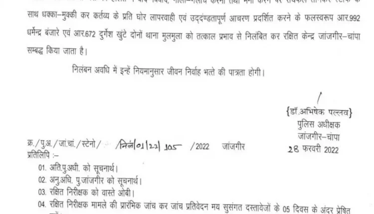 जांजगीर-चाम्पा। नशे की हालत में वरिष्ठ अधिकारियों से गाली-गलौच करने के साथ-साथ थाना स्टाफ पर राइफल तानने वाले दो आरक्षकों को आखिर सजा मिल ही गई. पुलिस अधीक्षक डॉ अभिषेक पल्लव ने दोनो आरक्षकों को तत्काल प्रभाव से निलंबित करते हुए लाइन अटैच कर दिया है. जानकारी के अनुसार, मुलमुला थाने में पदस्थ आरक्षक दुर्गेश खुंटे और धर्मेंद्र बंजारे ने नशे की हालत में वरिष्ठ अधिकारियों से विवाद करते हुए गाली-गलौच की थी, यही नहीं थाना स्टाफ पर दोनों ने राइफल भी तान दी थी. मामले की जानकारी मिलने पर एसपी डॉ. अभिषेक पल्लव ने कार्रवाई करते हुए दोनों को निलंबित कर लाइन अटैच कर दिया है. इस दौरान दोनों को जीवननिर्वहन भत्ता प्रदान किया जाएगा.