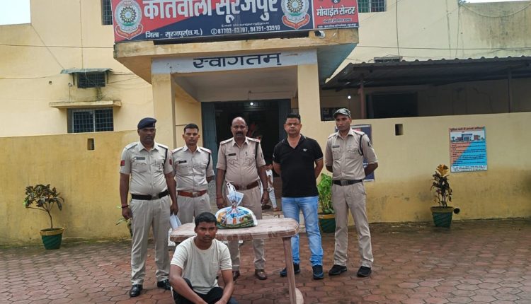 रविवार, 28 अगस्त को कोतवाली पुलिस को मुखबीर से सूचना मिली कि महुआपारा सूरजपुर निवासी मनीष साहू नशीली कफ सिरप लेकर मोटर सायकल में बिक्री करने जेलपारा शिवपार्क के पास ग्राहक की तलाश कर रहा है। अतिरिक्त पुलिस अधीक्षक मधुलिका सिंह व एसडीओपी सूरजपुर गीता वाघवानी के मार्गदर्शन में थाना सूरजपुर की पुलिस ने मुखबीर की सूचना पर त्वरित कार्यवाही करते हुए घेराबंदी कर मोटर सायकल सहित मनीष साहू पिता स्व. संजय साहू, उम्र 21 वर्ष निवासी महुआपारा को पकड़ा गया जिसके कब्जे से नशीली कफ सिरप फेनसाइरेक्स 47 नग जप्त किया गया जिसकी बाजारू कीमत 30 हजार रूपये है। मामले में आरोपी के विरूद्व धारा 21(सी) एनडीपीएस एक्ट के तहत कार्यवाही कर गिरफ्तार किया गया। इस कार्यवाही में थाना प्रभारी सूरजपुर प्रकाश राठौर, एसआई संतोष सिंह, एएसआई बजरंगी लाल चौहान, प्रधान आरक्षक मोहम्मत तालिब शेख, विवेकानंद सिंह, आरक्षक रामकुमार नायक, लक्ष्मी नारायण मिर्रे व बृजभवन कंवर सक्रिय रहे।