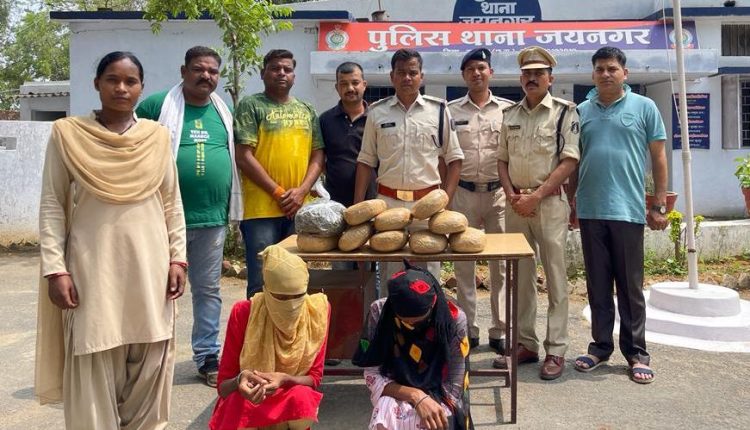 अतिरिक्त पुलिस अधीक्षक हरीश राठौर व सीएसपी जे.पी.भारतेन्दु के मार्गदर्शन में थाना जयनगर की पुलिस ने मुखबीर की सूचना पर ग्राम संजयनगर महाबीरपुर में घेराबंदी कर अंजु पैंकरा पिता संतराम उम्र 27 वर्ष एवं योगिता पैंकरा पिता संतराम पैंकरा उम्र 23 वर्ष निवासी कोतबा सुकवासीपारा, चौकी कोतबा, थाना बागबहरा जिला जशपुर को पकड़ा जिनके कब्जे से 10 किलो मादक पदार्थ गांजा जप्त किया है, जप्त गांजा की बाजारू कीमत करीब 2 लाख रूपये है। मामले में धारा 20(बी) एनडीपीएस एक्ट के तहत कार्यवाही करते हुए दोनों को गिरफ्तार किया गया है। इस कार्यवाही में थाना प्रभारी जयनगर सुभाष कुजूर, एसआई दिनेश राजवाड़े, एएसआई वरूण तिवारी, प्रवीण राठौर, प्रधान आरक्षक रजनीश त्रिपाठी, अशोक साहू, आरक्षक विकास मिश्रा, दीपक सिंह, रमेश कसेरा, महिला आरक्षक प्रमिला कुजूर व सैनिक नोहर राजवाड़े सक्रिय रहे।
