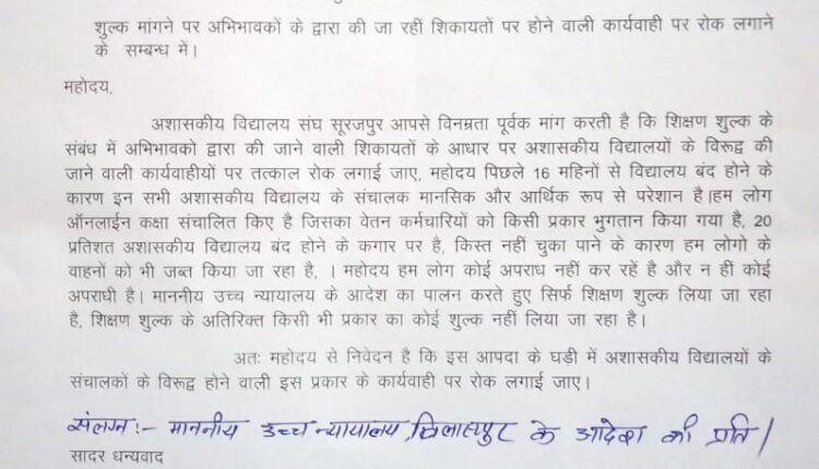 ज्ञात हो कि माननीय उच्च न्यायालय बिलासपुर के द्वारा 09/07/2020 को एक आदेश जारी हुआ था.. जिसमें. ये स्पष्ट बोला गया है कि सत्र 2020-021 के लिए सभी अशासकीय विद्यालय संचालक सिर्फ शिक्षण शुल्क लेंगे, शिक्षण शुल्क के अलावा कोई भी अतिरिक्त शुल्क नहीं लिया जाएगा.. माननीय उच्च न्यायालय के आदेशों का पालन करते हुए सभी निजी विद्यालय में सिर्फ शिक्षण लिया जा रहा है ऑनलाइन कक्षा भी संचालित की गयी है.। सभी शिक्षक/शिक्षिकाओं को वेतन भुगतान भी किया गया. सभी पालकों की मानसिकता बन गयी है शुल्क नहीं देने की.. और सक्षम अभिभावक भी शिकायत करने की धमकी देकर शुल्क नहीं जमा कर रहे है. बहुत निजी विद्यालय बंद होने के कगार पर हैं, किस्त नहीं चुका पाने के स्कूल वाहन जब्त होना शुरू हो गया है.. ऐसे मे निजी विद्यालय संचालक कहा जायेंगे।