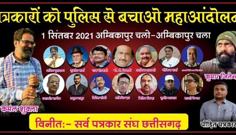 आप सभी को सूचना दिया जाता है कि 01/09/2021 को अंबिकापुर में “पत्रकारों को पुलिस से बचाओ” एक दिवसीय महानंदोलन की नीव रखी गई है, चूंकि पत्रकारों के हित में लिया गया यह फैसला पत्रकार सुरक्षा कानून के लिए महत्वपूर्ण साबित होगा, तो आप सामाजिक संगठन, पत्रकार संगठन, सभी आम जन अनिवार्य रूप से इस महाआंदोलन का हिस्सा बने और अपने आस-पास के भाइयों को जागरूक करने के साथ-साथ लेकर आना सुनिचित करें।