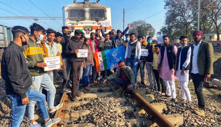 परीक्षार्थियों पर हुए बर्बरता पूर्ण लाठीचार्ज के विरोध में आज करंजी रेलवे स्टेशन मे एनएसयूआई के द्वारा प्रदर्शन