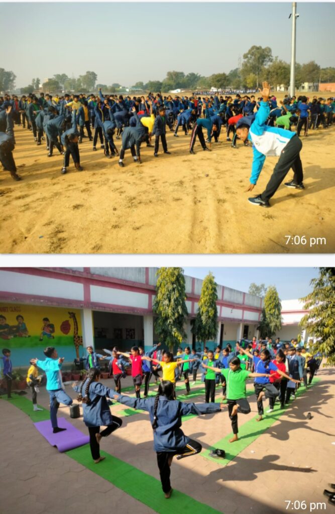 विद्यालय के छात्र बड़े ही उत्साह से योगाभ्यास कर रहें हैं तथा प्रसन्नचित हैं।