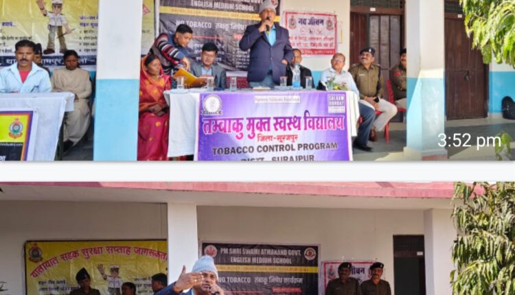 सूरजपुर/बतरा/IRN.24… सूरजपुर जिला कलेक्टर के आदेशानुसार, जिला शिक्षा अधिकारी के निर्देशानुसार , प्राचार्य पी. एम.श्री स्वामी आत्मानंद उत्कृष्ट विद्यालय बतरा के नेतृत्व तथा सेल्फ हेल्थ एजुकेशन एंड ऑर्गेनाइजेशन के संयुक्त तत्वाधान में तंबाकू निषेध कार्यक्रम पी एम श्री सेजेस विद्यालय, बतरा में आयोजित किया गया।इस अवसर पर मुख्य अतिथि एडिशनल एसपी संतोष कुमार मेहतो तथा विशिष्ट अतिथि नगर पुलिस अधीक्षक एस. एस. पैंकरा थे।कार्यक्रम में स्वागत उद्बोधन प्राचार्य गोवर्धन सिंह ने किया।अतिथिद्वय ने अपने वक्तव्य में बताया कि इस कार्यक्रम का उद्देश्य समाज, युवाओं और बच्चों को तंबाकू से बने उत्पादों के सेवन से होने वाली गंभीर बीमारियों जैसे कैंसर, टीवी, ह्रदय रोग आदि से बचाव के लिए जन जागृति लाना है। तंबाकू का सेवन सेहत के लिए जानलेवा हो सकता है। धूम्रपान मानसिक स्वास्थ्य के साथ ही शारीरिक सेहत पर भी नकारात्मक असर डाल सकता है।