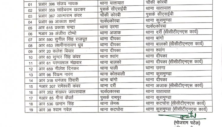 कोरबा : शुक्रवार की देर शाम पुलिस अधीक्षक भोजराम पटेल ने कोरबा जिले के 31 जवानों का तबादला किया है पाली थाने के प्रभारी आशीष सिंह को बांगो का नवीन प्रभार दिया गया तो वही अनिल पटेल को पाली थाने की बड़ी जिम्मेदारी दी गयी है वही रामपुर में पदस्थ शिवकुमार धारी को जतगा में नवीन पदस्थापना दी गयी है पुलिस विभाग में कसावट लाने के उद्देश्य से श्री पटेल ने फेरबदल किया है ताकि बेहतर पुलिसिंग हो सके और कोरबा जिले के आमजनों को लाभ मिल सके