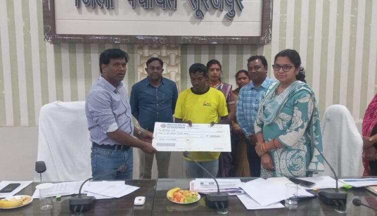 सूरजपुर/IRN.24… पीएमजेजेबीवाई योजना के तहत स्वयं सहायता समूह से जुड़ी स्व. मनमेत ग्राम पंचायत भंवराही निवासी के परिजन इतवारू राम को कलेक्टर श्री. एस. जयवर्धन निजी एवं जिला पंचायत सीईओ कमलेश नंदिनी साहू के द्वारा 02 लाख रुपये बीमा क्लेम राशि का चेक दिया गया। मनमेत की मृत्यु 14 अक्टूबर 2024 को हुआ। मृत्यु से पूर्व राष्ट्रीय ग्रामीण आजीविका मिशन बिहान योजना अंतर्गत पीएमजेजेबीवाई का बीमा कराया गया था। बिहान के कैडर बीपीएम दिलीप कुमार एक्का, जनपद पंचायत सीईओ नीलेश सोनी एवं शाखा प्रबंधक श्री हेमन्त कुमार उपस्थित थे।