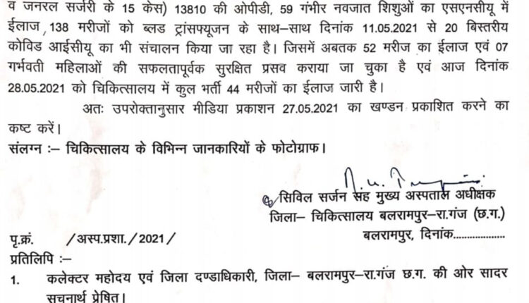बलरामपुर: कल प्रिंट मीडिया में प्रकाशित खबर का बलरामपुर जिला अस्पताल प्रबंधन ने फोटोग्राफ एवं प्रेस विज्ञप्ति जारी करते हुए खंडन किया है अस्पताल प्रबंधन ने मरीजों के भटकने के कथन को भी व्यर्थ बताया है।