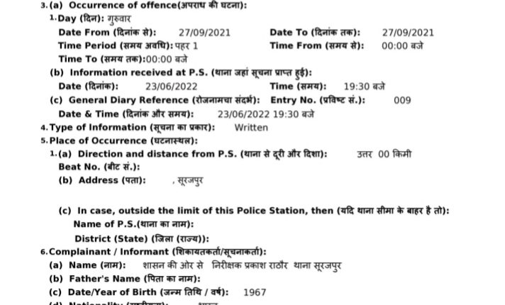 सूरजपुर निवासी ओमप्रकाश राजवाड़े पिता दीवान चंद राजवाड़े व तीन लोगों ने सूरजपुर पुलिस अधीक्षक को 28 जनवरी 2022 को एक शिकायत किया था जिसमें उन्होंने यह आरोप लगाया था कि सूरजपुर के ही निवासी अंबिका प्रसाद राजवाड़े के द्वारा अक्टूबर 2021 को राजस्व विभाग के राजस्व निरीक्षक के साथ मिलकर खसरा नंबर 58 का फर्जी तरीके से रजिस्ट्री अंबिकापुर के उप पंजीयन कार्यालय में सुरजपुर निवासी श्रीमती विमला उपाध्याय के नाम पर किया गया है।
