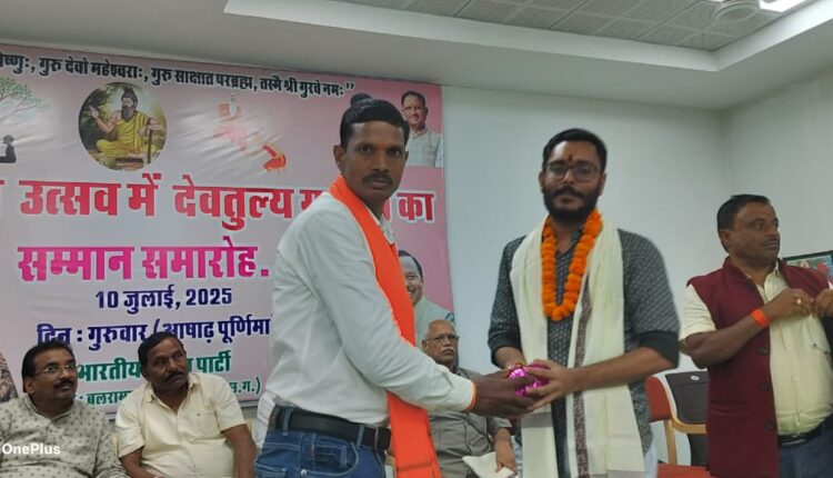 जिला मुख्यालय बलरामपुर में गुरु पूर्णिमा के अवसर पर अलग-अलग विधाओं में गुरुओं का सम्मान किया गया, इस कार्यक्रम में मुख्य रूप से जिला भाजपा अध्यक्ष ओम प्रकाश जायसवाल, नगर पालिका अध्यक्ष लोधी एक्का,गोपाल कृष्ण मिश्र,बिहारी पाल,बंसीधर गुप्ता, दीनानाथ यादव,दिलीप सोनी, सत्य प्रकाश सिंह, कोदूराम द्विवेदी, डॉ अर्चना गुप्ता,इत्यादि वरिष्ठों के साथ साथ शिक्षक, शिक्षिकाओं एवं स्वामी आत्मानंद स्कूल से आए सैकड़ों बच्चों और स्थानीय लोगों की मौजूदगी रही कार्यक्रम के संयोजक मुन्ना लाल चौधरी एवं भानु प्रकाश दीक्षित रहे।