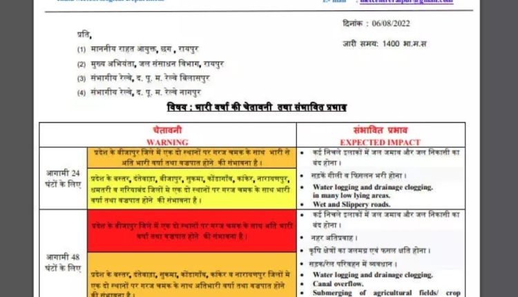 बारिश ब्रेकिंग: मौसम विभाग ने छत्तीसगढ़ के कई जिलों के लिए जारी किया रेड और येलो अलर्ट