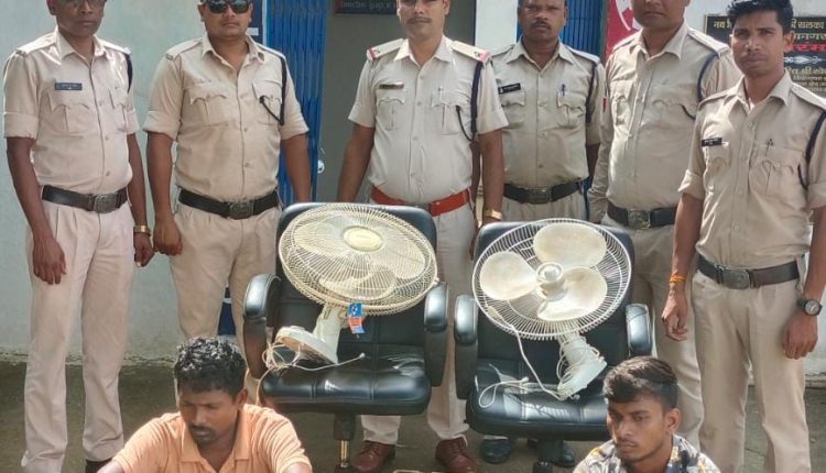 चोरी की घटना की सूचना पर पुलिस अधीक्षक श्री रामकृष्ण साहू ने चौकी प्रभारी को अज्ञात चोर की पतासाजी करते हुए जल्द गिरफ्तार करने के निर्देश दिए। अतिरिक्त पुलिस अधीक्षक हरीश राठौर व एसडीओपी प्रेमनगर प्रकाश सोनी के मार्गदर्शन में चौकी उमेश्वरपुर की पुलिस चोरों की पतासाजी में लगी थी इसी बीच मुखबीर से सूचना प्राप्त हुई कि नमना गांव के 2 व्यक्ति कुछ सामान कहीं से लेकर आए है और बिक्री करने की बात कह रहे है। सूचना पर पुलिस ने संदेही ग्राम नमना निवासी रामप्रसाद पिता स्व. हेमसाय प्रजापति उम्र 38 वर्ष एवं दीपेन्द्र कुमार पिता स्व. चक्रधर तिवारी उम्र 21 वर्ष को पकड़ा। पूछताछ पर दोनों ने बेस कैम्प ग्राम नमना में चोरी करना स्वीकार किया। आरोपियों के निशानदेही पर 4 नग पंखा, 2 नग ट्यूब लाईट, 2 नग व्हीलचेयर, 1 नग बड़ा हाईलोजन बल्ब कुल कीमती 30 हजार रूपये का बरामद कर दोनों आरोपियों को गिरफ्तार किया गया।