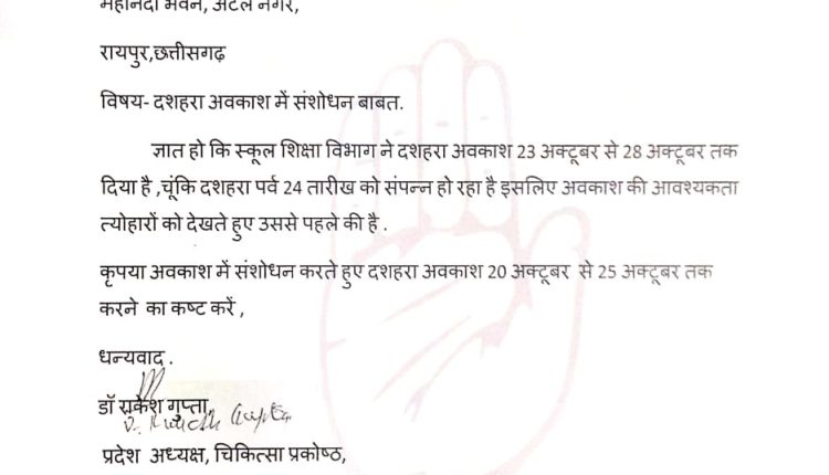 रायपुर। चिकित्सा प्रकोष्ठ के अध्यक्ष राकेश गुप्ता ने स्कूलों में दशहरा की दी गई छुट्टी में संशोधन की मांग की है। राकेश गुप्ता ने शिक्षा विभाग द्वारा जारी छुट्टी 23 अक्टूबर से 28 अक्टूबर की जगह 20 अक्टूबर से 25 अक्टूबर तक देने की मांग की है। नीचे पढ़ें पत्र…