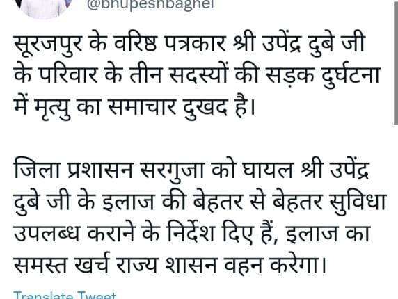 राहुल शुक्ला, अम्बिकापुर: भीषण सड़क हादसे में पत्रकार उपेन्द्र दुबे के परिवार के तीन लोगों की मृत्यु हो गई तथा उपेन्द्र दुबे गंभीर रूप से घायल हो गए।जिन्हें इलाज़ के जीवन ज्योति अस्पताल में भर्ती कराया गया है। मुख्यमंत्री भूपेश बघेल ने इस मामले में संज्ञान लेते हुए जिला प्रशासन को बेहतर इलाज कराने हेतु निर्देशित किया है साथ ही इलाज का सारा खर्च सरकार द्वारा वहन किया जाएगा। मुख्यमंत्री ने इस मामले में दुःख व्यक्त किया है।